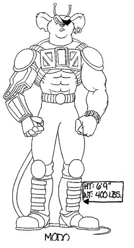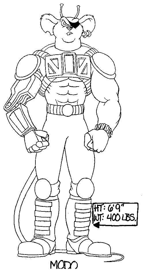 Первое, что бросается в глаза при взгляде на Модо, — это его внушительные размеры. Второе, что вы, вероятно, заметите, — это то, что его правая рука сделана не из плоти и крови, а из металла. Конечность — роботизированная замена той, которую он потерял во время Плутаркианской войны. Доктор Карбункул, работая над созданием армии бионических рабов для Плутарка, прикрепил эту руку против воли Модо в лаборатории. Однако это оказалось крахом всего плана — Модо очнулся до того, как была осуществлена вторая фаза проекта — тщательная промывка мозгов — и использовал двуствольную лазерную пушку руки чтобы освободить себя и других захваченных Борцов за Свободу.