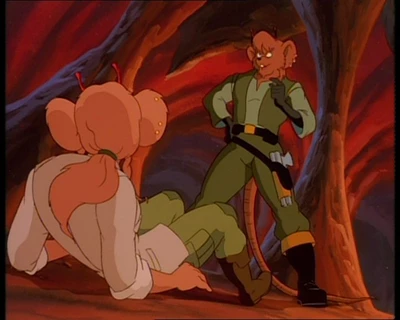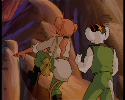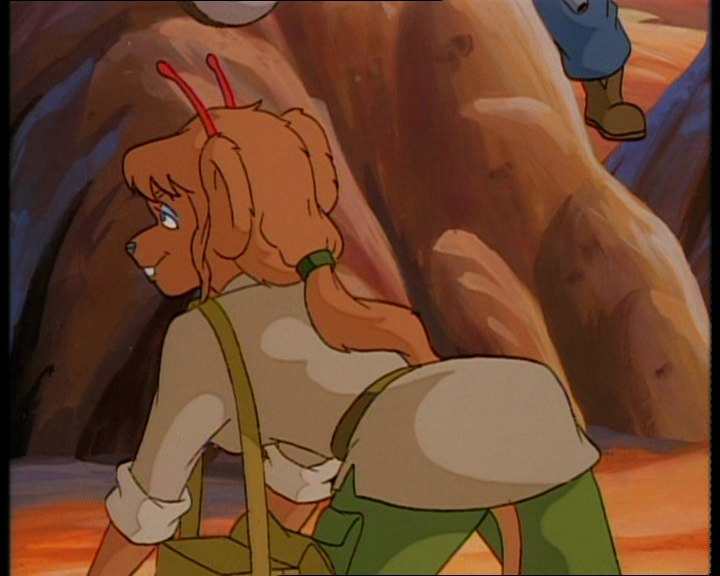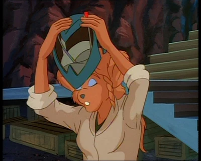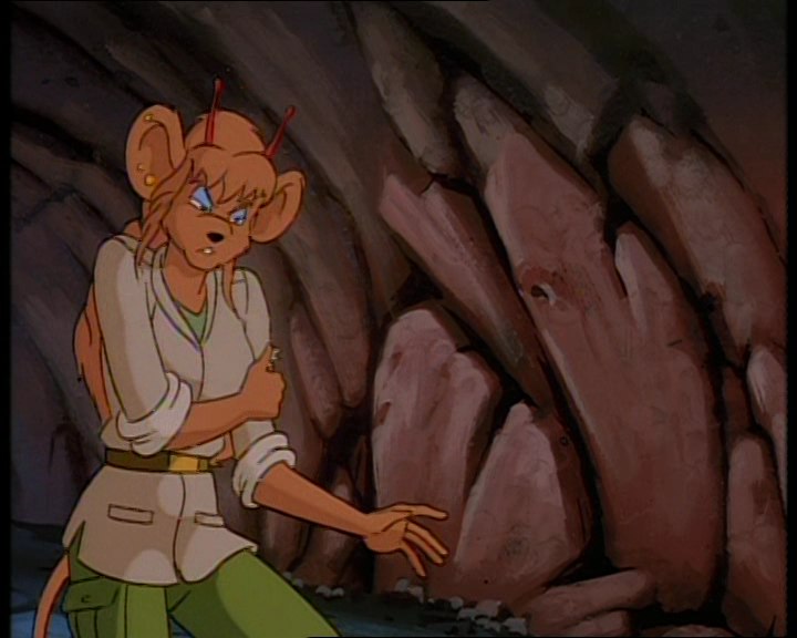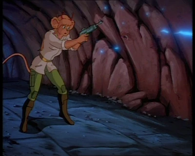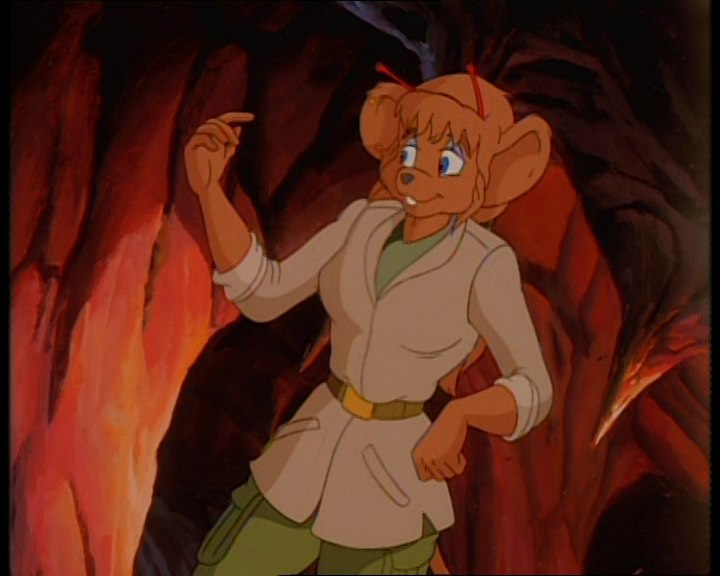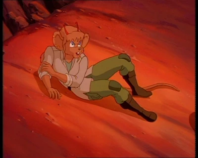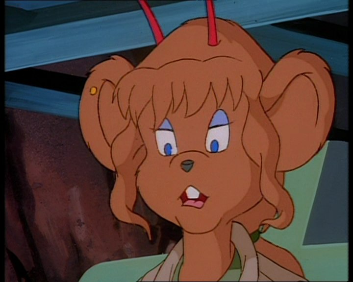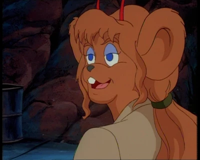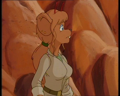 Песчаная мышка с голубыми глазами и волнистыми волосами, завязанными в хвост. На ней одета светло-бежевая куртка с длинными рукавами и воротником. Куртка имеет два кармана в нижней части и надета поверх зеленой футболки или кофты. Талия перехвачена широким коричневым поясом с золотой пряжкой. Зеленые штаны с карманами на бедре и накладками на коленях. Высокие коричневые сапоги. В правом ухе три золотых гвоздика.