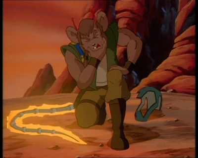 Предпочитает кулаки, особенно коронный удар правым кулаком в морду. После экспериментов Карбункула грозным оружием стал бионичекский хвост (в «боевом режиме» хвост светиться, словно электрический разряд). На правом бедре пристегнута кобура с бластером.