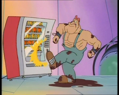 Мстительный торговый автомат: Чумазоид колотит по несговорчивому торговому автомату, пока тот не засыпает его шоколадными батончиками, и ему приходится прятаться за Фредом-Мутантом, чтобы защититься.
